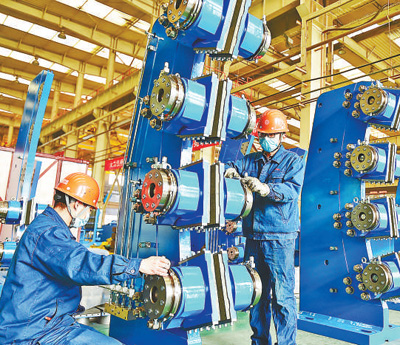在河南省洛阳市中信重工车间内,工人忙着赶制矿山装备产品订单。黄政伟摄(人民视觉)