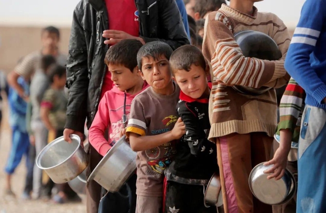 △伊拉克摩苏尔一所难民营里,无家可归的民众排队领取食物。