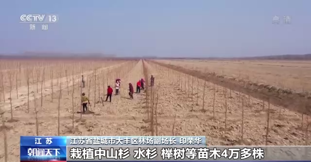 江苏省盐城市大丰区林场副场长 印荣华:我们沿海防护林三期工程一共1200亩,目前已完成造林800亩,栽植中山杉、水杉、榉树等苗木4万多株,这样就进一步增加我们森林资源总量,使沿海生态防护林功能更加完善。