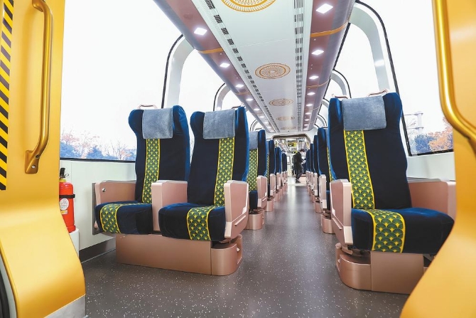 列车车身以蓝色为主基调,车厢内通过东巴文与纳西族艺术元素的装饰展现出独具特色的丽江风情。列车前窗采用超大曲面前窗设计,侧窗的玻璃高达1.9米,保证了旅客观景的开阔视野。此外,通过电动可调的变色玻璃设计,游客可根据日照强度适时调节侧窗颜色。