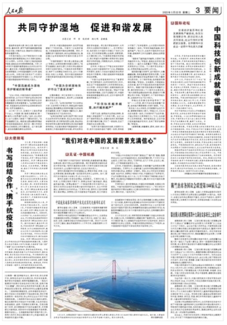 今年是中国加入《关于特别是作为水禽栖息地的国际重要湿地公约》(简称《湿地公约》)30周年。30年来,中国大力推进湿地保护修复,湿地生态状况得到持续改善。今年1月发布的《中国国际重要湿地生态状况白皮书》显示,截至目前,中国国际重要湿地生态状况总体保持稳定,分布有湿地植物2258种、湿地鸟类260种。本报记者日前采访了3位参与或见证中国湿地保护的国际人士,听他们讲述中国加强湿地保护带来的巨大变化。