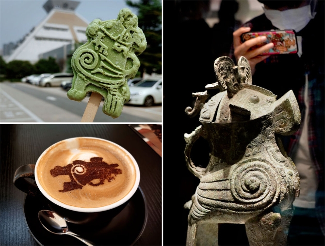 拼版照片:右图为2020年9月24日,参观者在河南博物院主展馆内拍摄展品“妇好鸮尊”(新华社记者李安摄);左上图为2020年9月24日拍摄的河南博物院推出的“妇好鸮尊”冰淇淋(新华社记者李安摄);左下图为2020年9月24日拍摄的河南博物院推出的“妇好鸮尊”图样咖啡(新华社记者李文哲摄)。新华社发
