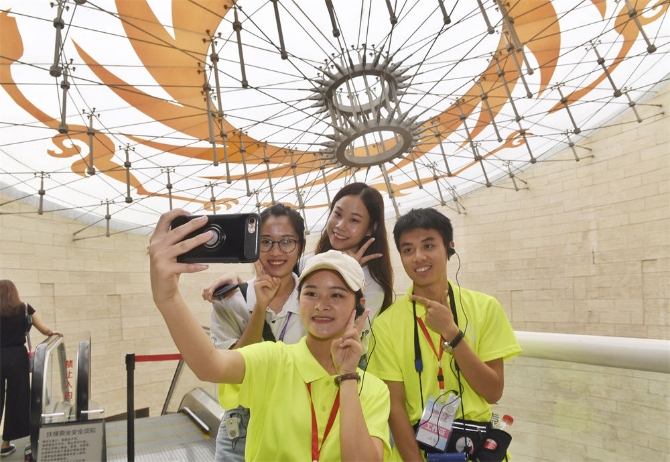 参加交流活动的香港青年(后排)在四川金沙遗址博物馆陈列馆有“太阳神鸟”图案的房顶前与志愿者(前排)合影留念(2019年8月25日摄)。新华社记者 刘坤 摄