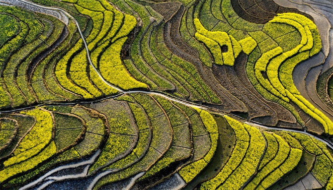 这是陕西省汉阴县漩涡镇凤堰古梯田里的油菜花(2020年3月18日摄,无人机照片)。新华社记者 陶明 摄