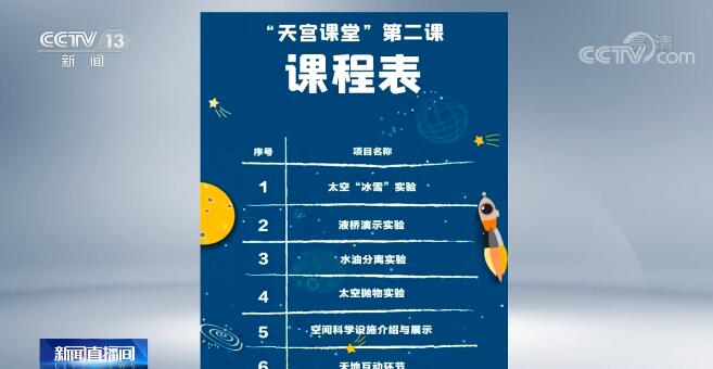 这次授课活动讲什么?来看一下课程表:届时,航天员将在轨演示太空“冰雪”实验、液桥演示实验、水油分离实验、太空抛物实验,介绍与展示空间科学设施,另外还有天地互动环节,航天员真诚邀请社会各界特别是广大青少年在地面同步尝试开展相关实验。