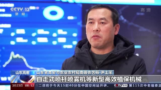 山东省高密市农业农村局高级农艺师 尹士采:我们利用植保无人机、自走式喷杆喷雾机等新型高效植保机械,开展小麦病虫草害统防统治,同时加强对农户、家庭农场的指导服务。