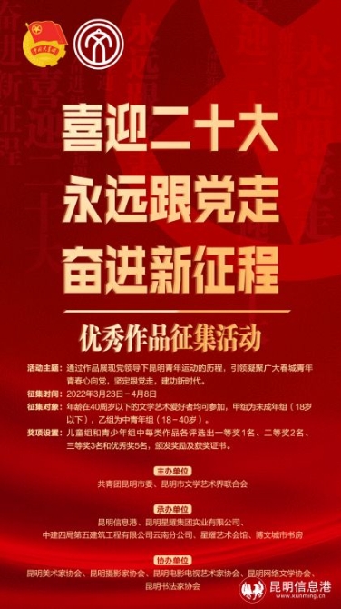 昆明信息港讯 记者张薇 3月24日,由共青团昆明市委、昆明市文学艺术界联合会共同主办的“喜迎二十大、永远跟党走、奋进新征程”优秀作品征集活动启动,活动旨在深入贯彻落实习近平总书记关于青年工作的重要思想,营造喜迎党的二十大青春氛围,通过征集优秀作品展现中国共产党领导下昆明青年运动历程,引领凝聚广大青年青春心向党、坚定跟党走的决心。
