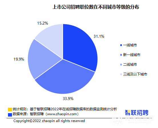 从城市等级来看,上市公司招聘职位主要集中在一线城市和新一线城市,分别占31.1%和33.9%,二线和三线以下城市各占不到两成。上市公司多分布在发达城市,因此招聘岗位呈现明显的高线集中特征。