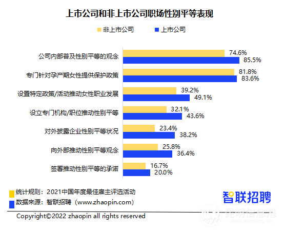 85.5%的上市公司在公司内部普及性别平等观念,49%的制定政策/活动推动女性职业发展,44%的设立专门机构/岗位推动性别平等,均比非上市公司高10个百分点。数据显示,上市公司的女员工比例达45.2%,非上市公司为41.1%;上市公司高层女性占比为26.4%,非上市公司为22.9%。2021年上市公司晋升员工中,女性占42.4%,比非上市公司高7个百分点。