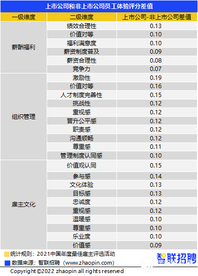 从薪酬福利、组织管理、雇主文化三个维度来看,上市公司在各个维度的评分都高于非上市公司。上市公司员工对绩效合理性的满意度评分比非上市公司高0.13,价值对等和福利满意度分别比非上市公司高0.1。上市公司在激励性、价值对等、人才制度完整性方面,分别高于非上市公司0.19、0.16、0.15。在雇主文化层面,上市公司员工在价值观认同和参与感方面,分别高出非上市公司0.15和0.14分。(昆明信息港 记者江枫)