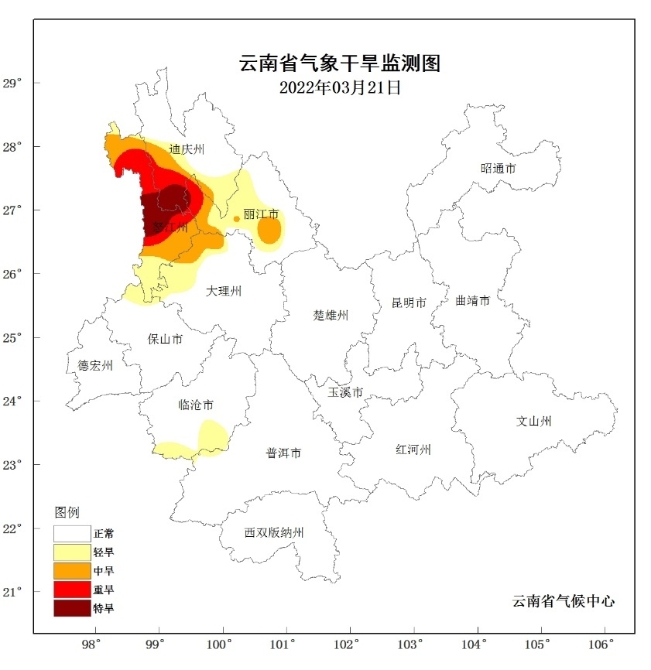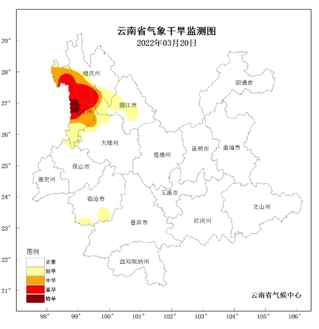 由于气温偏高,降水偏少,滇西北等地气象干旱发展较快,据气象部门3月23日监测,全省有13个站点(占全省10%)出现气象干旱,其中5站为轻旱,4站为中旱、2站为重旱、2站为特旱,重特旱主要是分布在迪庆州南部、怒江州中大部。