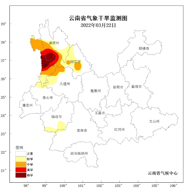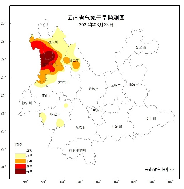 由于气温偏高,降水偏少,滇西北等地气象干旱发展较快,据3月23日监测,全省有13个站点(占全省10%)出现气象干旱,其中5站为轻旱,4站为中旱、2站为重旱、2站为特旱,重特旱主要是分布在迪庆州南部、怒江州中大部。