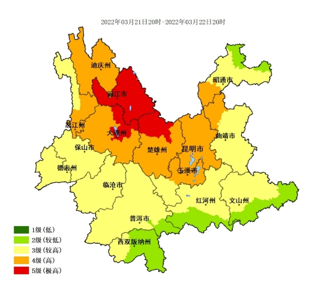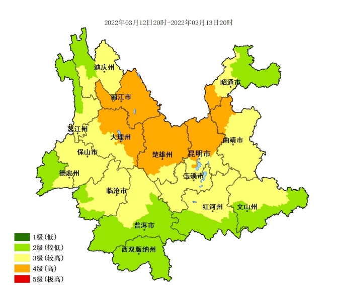 丽江、大理东北部、楚雄北部为5级(极高),迪庆、怒江南部、大理西部和南部、楚雄中南部、昆明、玉溪北部、曲靖西部、昭通南部4级(高),其他地区为2~3级。