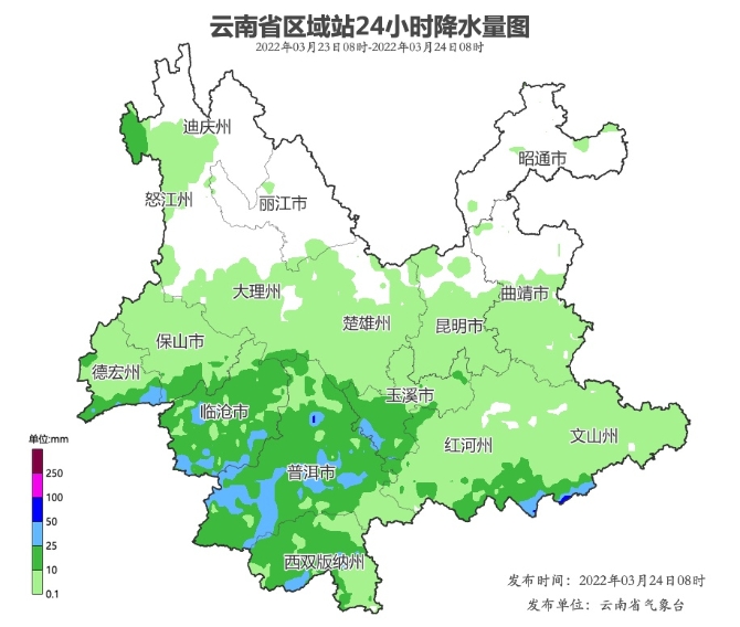 2022年3月23日08时至24日08时实况:文山南部、红河中南部、玉溪南部、西双版纳、普洱、临沧、德宏南部、保山南部出现中到大雨局部暴雨,昭通、曲靖北部、丽江、迪庆西部、大理北部多云,其他地区有阵雨局部中雨。