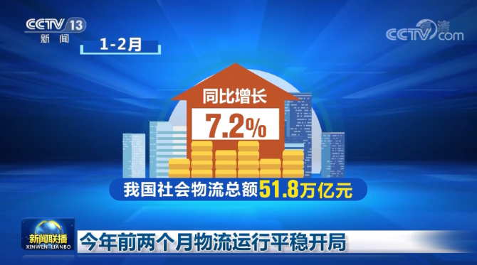 中国物流与采购联合会今天(3月24日)公布的数据显示,今年1—2月,我国物流运行总体平稳,社会物流总额增长较快。今年1—2月,我国社会物流总额51.8万亿元,同比增长7.2%,物流总额增速延续回升态势,同时明显高于疫情前2019年水平。从结构看,扩内需、促消费政策效应持续显现,工业、消费物流需求保持较快增长。1—2月,工业品物流总额同比增长7.5%,较2020—2021年两年平均增速加快1.4个百分点。消费品制造业物流需求同比增长9.7%,较2020—2021年两年平均增速加快5.2个百分点。另外,进口物流需求持续回落,但降幅在收窄,物流在促进产业链、供应链稳定运行中的作用继续凸显。