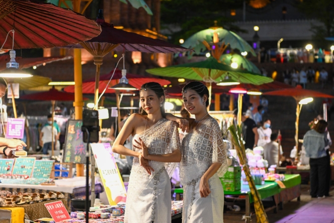 3月17日,游客在西双版纳景洪市告庄西双景的星光夜市游览拍照。(新华社记者 曹梦瑶 摄)