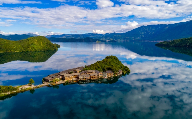 2021年9月24日,泸沽湖里格半岛景色(无人机照片)。(新华社记者 陈欣波 摄)