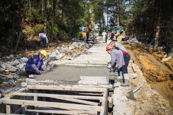 工人在贵州省惠水县雅水镇修建农村水渠(3月16日摄)。新华社记者 陶亮 摄