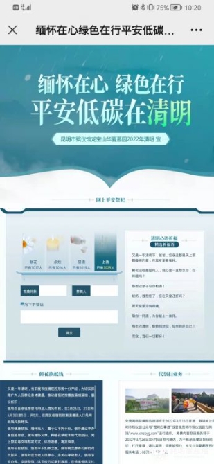 昆明信息港讯 “缅怀在心绿色在行 平安低碳在清明”昆明市殡仪馆2022年清明祭扫网络专题今天上线啦!广大市民朋友可以登录网络专题开展网上祭扫。同时,为减少人员集聚、扎堆,阻断传染源,避免人员交叉感染,昆明市殡仪馆龙宝山华夏墓园继续推出免费“代客祭扫”服务。