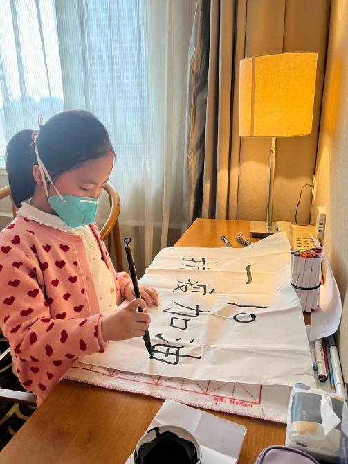 一名小学生通过书法作品为隔离中的伙伴们加油打气。(受访者供图)
