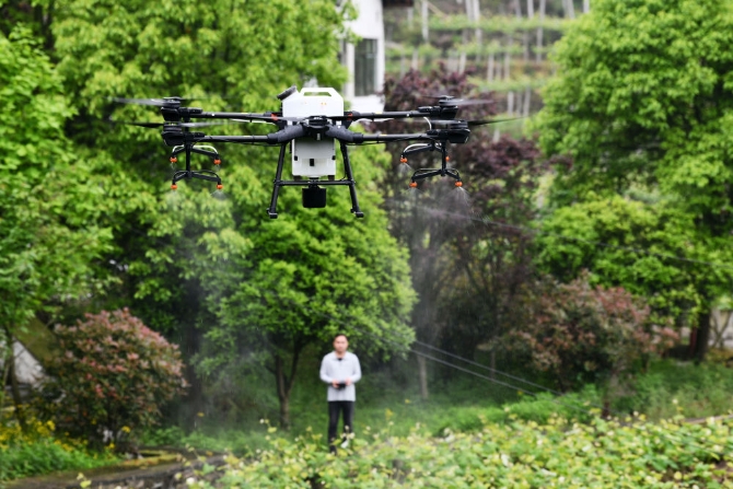 在贵州省贵阳市息烽县小寨坝镇红岩村,农技人员在葡萄基地进行无人机植保作业(2021年4月17日摄)。新华社记者 杨文斌 摄