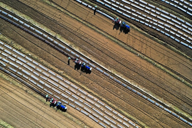 在贵州省威宁县双龙镇凉山社区的众果农机社会化服务基地,农民驾驶马铃薯自动播种机在播种(3月8日摄,无人机照片)。新华社记者 杨文斌 摄