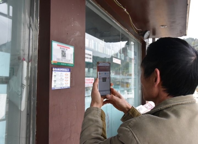 贵州余庆县花山苗族乡花山村村民魏廷福展示用手机扫码“黔农智慧门牌”进入到相应的政务服务页面(2月18日摄)。新华社记者 李凡 摄