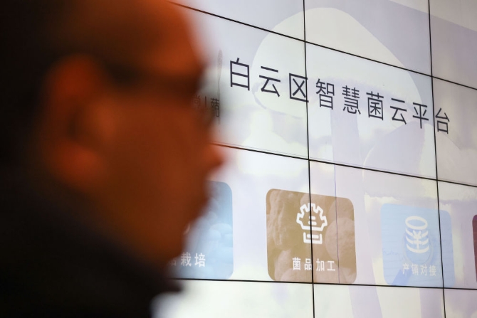 工作人员在贵阳市白云区食用菌产业示范园智能菇房内查看菌菇生长情况(2月14日摄)。新华社记者 欧东衢 摄