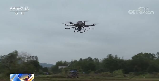 在广东阳江,春耕土地上机械作业热火朝天。在阳东区合山镇那洋村,五台拖拉机在地上来回忙碌平整田地,一台水稻直播机在天空有规则地飞行。