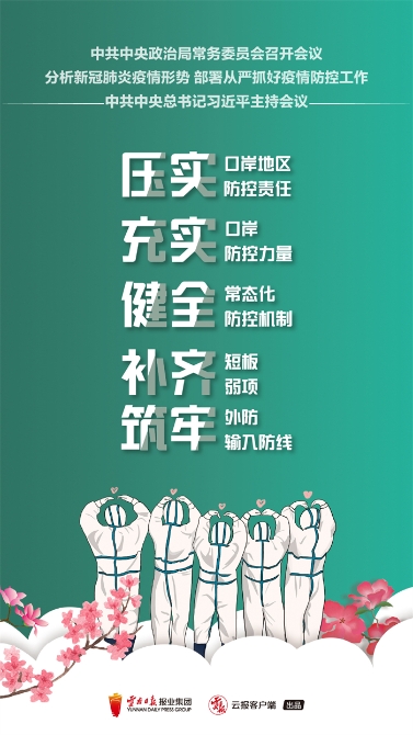 会议强调与新冠肺炎疫情的斗争必须慎终如始,坚决打赢疫情防控阻击战、歼灭战。必须在措施上更实更细,在战备要素、边境防控、重点场所、社区管控上再细化实化,严格落实“一口岸一方案”“一地一策”“一校一策”及“五必查”“六必强”等举措,坚决把各项防控措施落实到位。必须在责任上更强更硬,实之再实强化组织领导、严之更严强化监督问责、细之更细强化宣传引导,严防死守,凝聚合力,抓细抓实疫情防控各项工作。