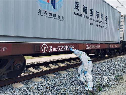 和煦的阳光穿梭于微隙的气息,透过稠密的树叶撒落下来,成了点点金色的光斑。3月27日16时20分,对讲机中传来值班民警的声音,“21053次出境列车预计16时50分左右推进至2场1道并办理出境手续,车体检查组可以着防护服做好接车准备。”
