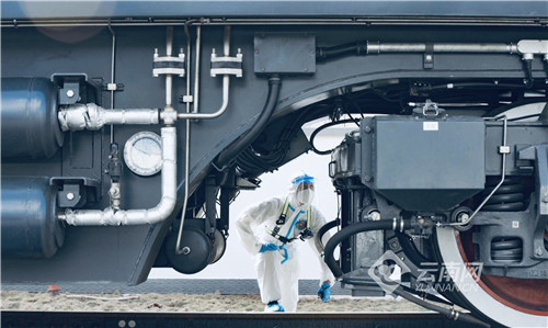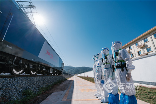 云南磨憨边检站铁路口岸执勤队民警严格按照防疫要求,身着防护服,戴口罩、面屏,携带对讲机、执法记录仪等执法执勤装备,提前进入边检货检场查验区,等待出境列车的到来。