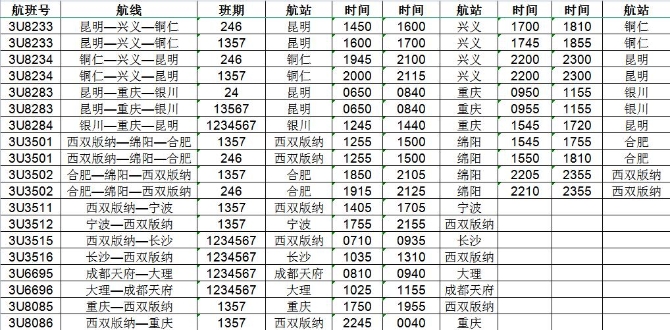 换季期间,川航还将新开昆明=重庆=银川、西双版纳=绵阳=合肥、西双版纳=宁波、西双版纳=长沙、西双版纳=重庆5条云南航线,恢复昆明=西双版纳、昆明=西宁=敦煌、昆明=南昌、西双版纳=贵阳、丽江=宜宾=西安航线。