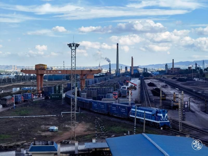中国昆明,王家营西站。一列载有模具、LED路灯、液晶显示屏等商品的国际货运列车缓缓开出火车站,驶向老挝万象。