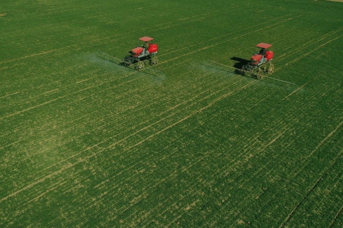 近日,在河北省邢台市南和区金沙河农作物种植专业合作社,农民驾驶农业机械在田间喷洒农药。(无人机照片,受访者供图)