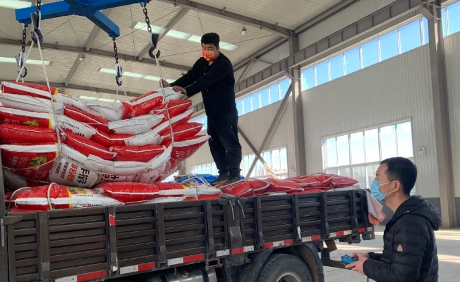 河北省秦皇岛市抚宁区供销社农资配送中心的工作人员正在装运肥料,准备配送。(受访者供图)