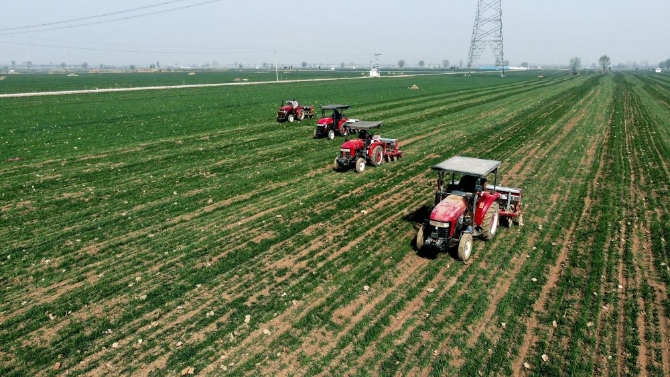 近日,在河北省邢台市南和区金沙河农作物种植专业合作社,农民驾驶农业机械在田间施肥。(无人机照片,受访者供图)