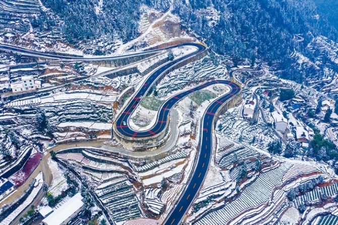 湖北省宜昌市秭归县把“四好农村路”建设与“美丽乡村”、“全域旅游”建设深度融合,助力乡村振兴。图为芝茅路(芝兰—茅坪)在雪中蜿蜒(2022年1月29日摄)。 求是图片 郑坤/摄