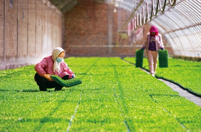 地处黄土高原的宁夏固原市原州区彭堡镇姚磨村,近年来因地制宜发展冷凉蔬菜产业,助力乡村振兴。图为2022年3月18日姚磨村农户在育苗棚内劳作。 新华社记者 杨植森/摄
