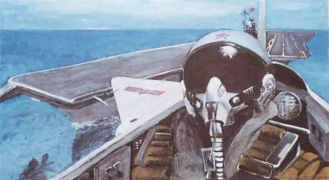 画中,一名飞行员驾驶舰载机