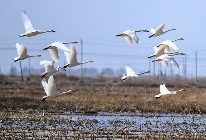 据达拉特旗林业和草原局观测,近年来当地迁徙的候鸟数量和种类逐年增加,最多时能达到4万只左右,种类包括大天鹅、小天鹅、鸿雁和野鸭等10余种。