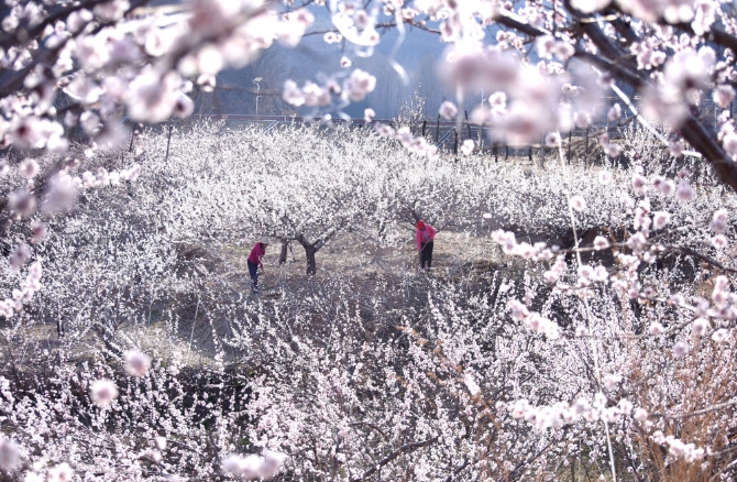 ↑3月28日,山东省淄博市沂源县悦庄镇桃花峪村的农民在杏花田间劳作。