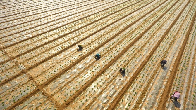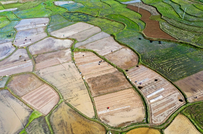 ↑3月28日,在湖南省永州市道县白马渡镇樟武坊村,村民在农田里育早稻秧苗(无人机照片)。