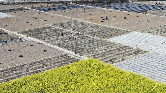 ↑3月28日,在山东省聊城市茌平区贾寨镇邢胡刘村,村民在田间管理种植的甘蓝(无人机照片)。