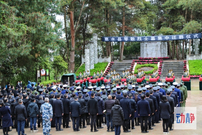 上午10时,护送车队缓缓驶入惠水县烈士陵园,参与集中迁葬仪式的人员全体肃立,礼迎棺椁,现场奏唱国歌,全体人员肃立,向烈士默哀、行鞠躬礼。