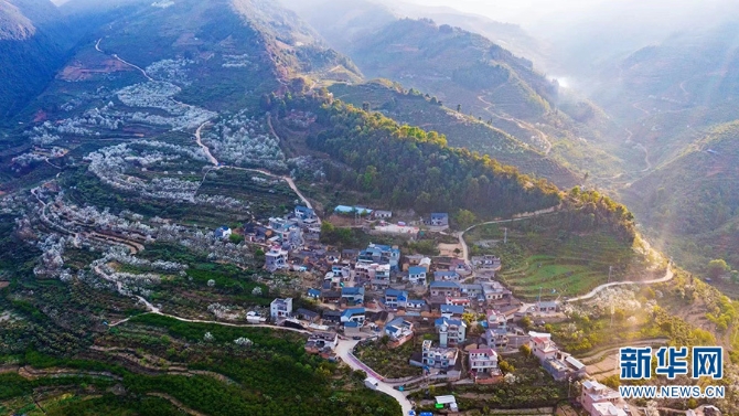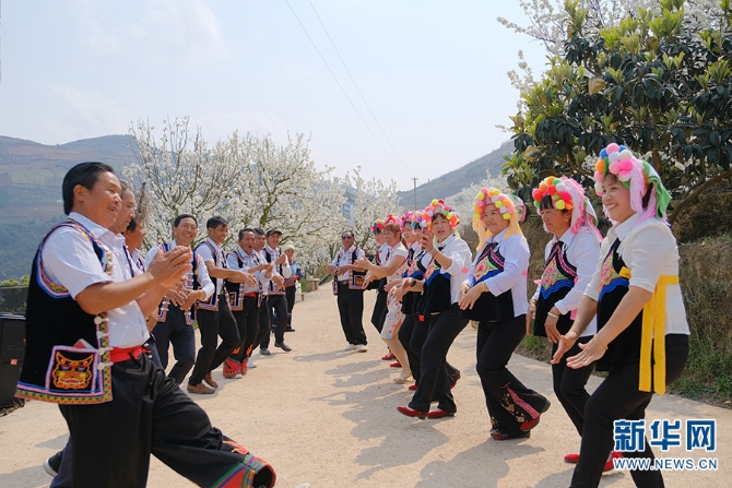理海寨村民在花树下踏歌起舞(摄于3月20日)。新华网发(张珏 摄)