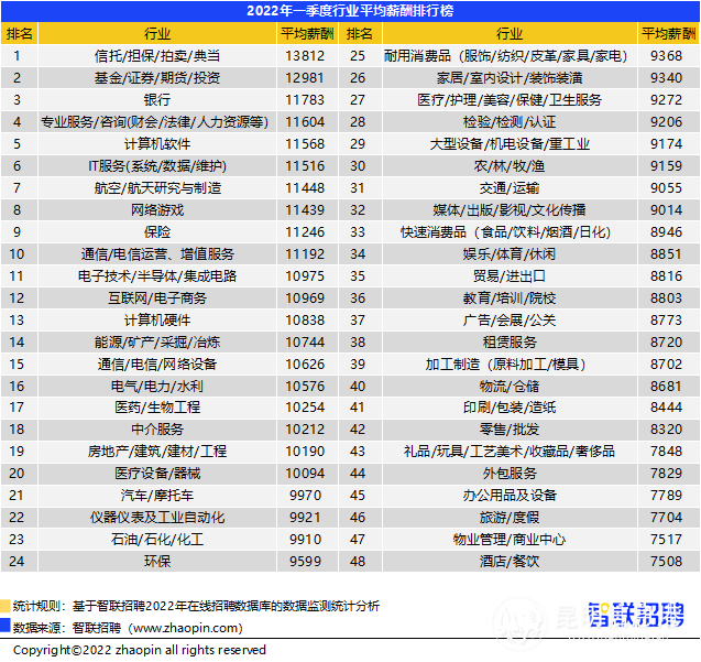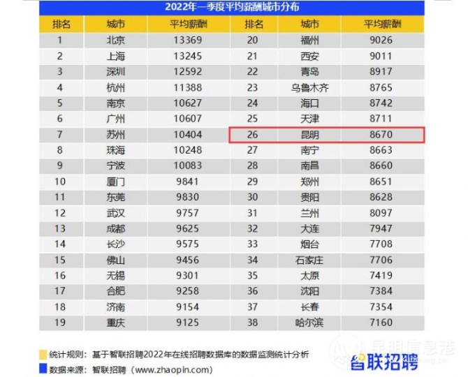 智联招聘近日发布《2022年第一季度<中国企业招聘薪酬报告>》,展示国内38个核心城市的企业招聘薪酬水平。其中指出,一季度全国平均招聘薪酬为10014元/月,薪酬中位数为7999元/月。昆明以8670元/月的平均招聘薪酬位列第26位。此外,一季度油价上涨带动石油业薪资增长4.8%。