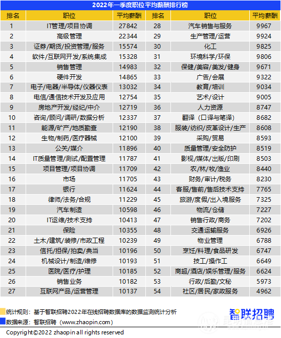 从职业来看,管理岗薪酬依然位居榜首,汽车制造岗位薪酬升至10598元/月,房产中介招聘月薪达到12719元。与互联网行业薪资下降对应,IT管理岗一季度招聘薪酬环比下降4.1%,在所有职业中降幅最大,互联网产品/运营管理岗薪资也下降2.6%。