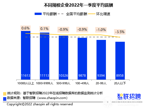 一季度不同规模企业平均招聘薪资差距扩大,其中,规模在10000人以上的超大型企业的薪资水平仍然最为可观,月均工资达11613元,环比增速为0.6%。1000-9999人的大型企业的薪资略高于上季度,达到11113元/月。中型企业薪酬与上季度相比略有下降,500-999人和100-499人的企业薪酬环比分别下降0.9%。20-99人的小型企业薪资低于全国平均水平,且较上季度下降1%至9394元/月。20人以下微型企业薪酬更下降3.5%,跌至8958元/月。