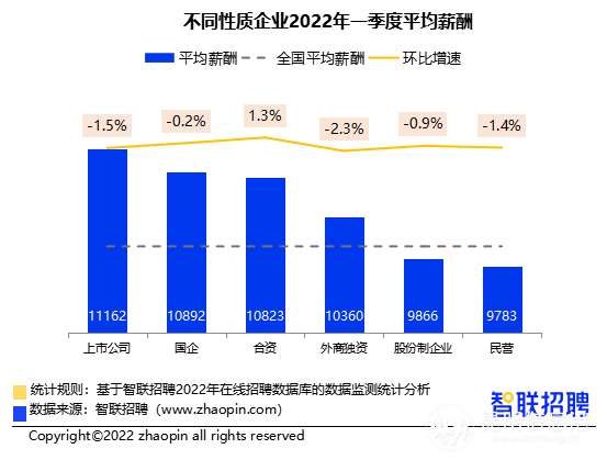 从企业性质看,一季度上市公司继续以11162元/月的平均招聘薪酬稳居第一。国企以10892元/月排名第二,与上季度基本相当。合资企业平均招聘薪酬较上季度提升1.3%,排在第三位。外商独资企业的平均招聘薪酬则环比则下降2.3%,不过仍高于全国平均水平。股份制企业和民营企业的薪酬水平分别为9866元/月和9783元/,低于全国平均薪酬,且低于上季度水平。